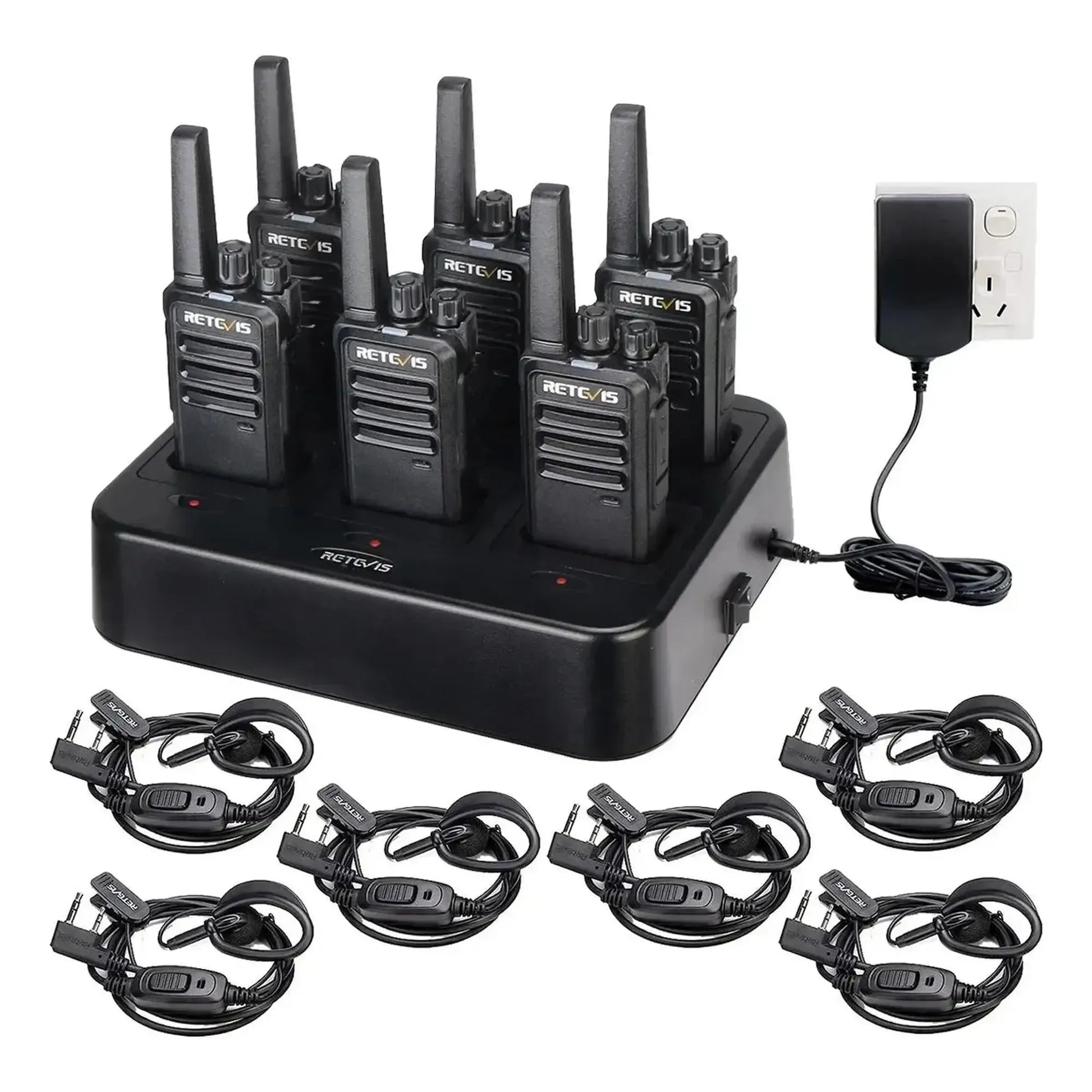 Set 6 radios Retevis RT68 UHF Analógico 16 canales 2W con base dock de carga y manos libres