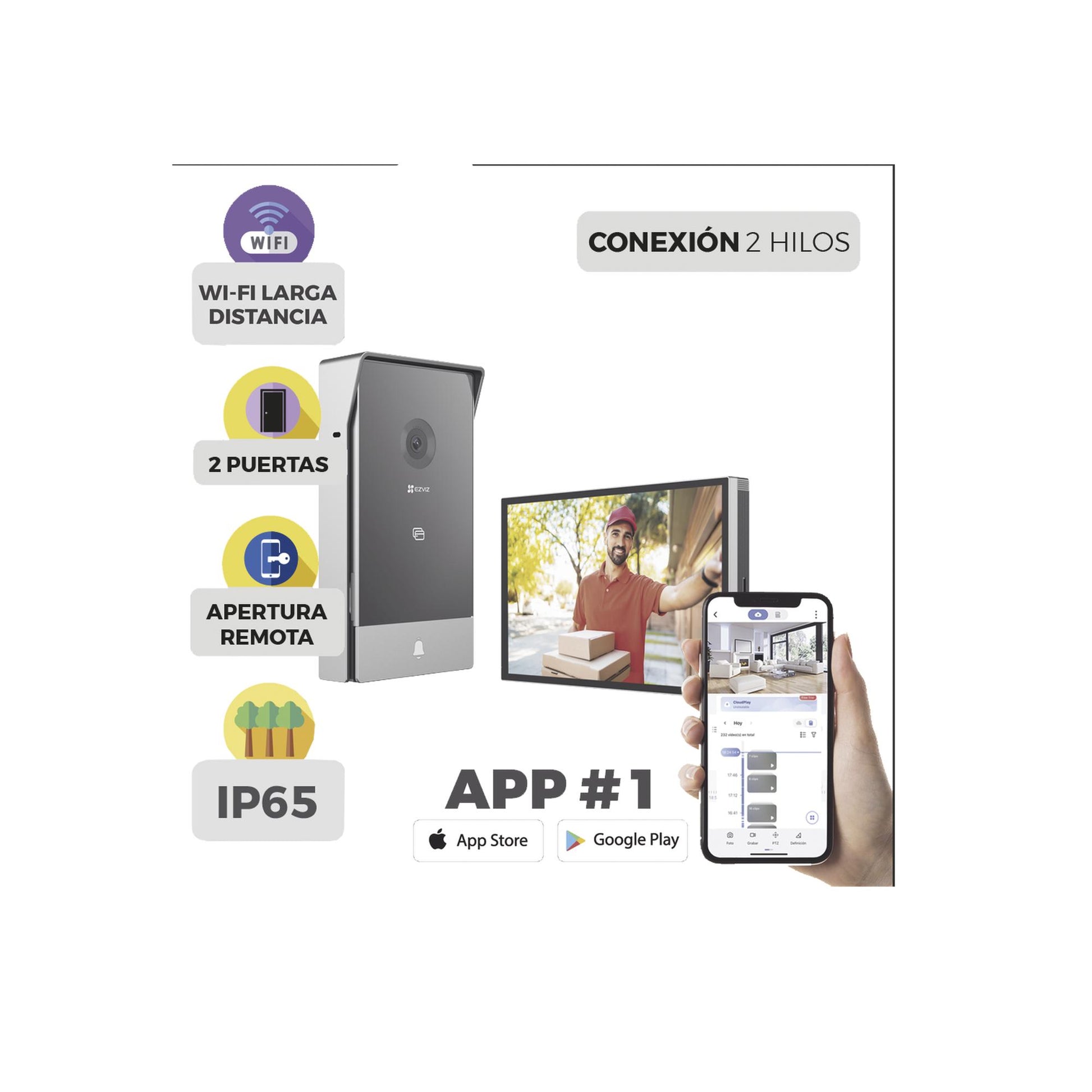 Videoportero IP Conexión a 2 Hilos / Con Monitor Wi-Fi para Interior / Frente de Calle IP65 Uso En Exterior Debe Tener Protección / Cámara 3 Megapíxel / Llamada a la App / Apertura remota / Apertura de 1 Puerta y un 1 Porton